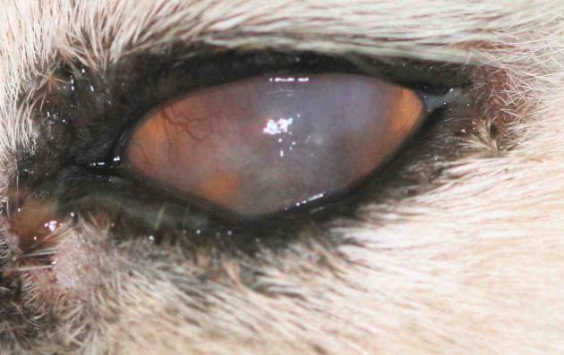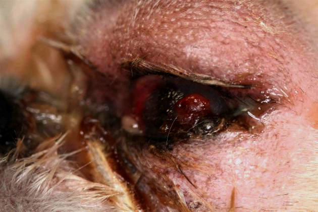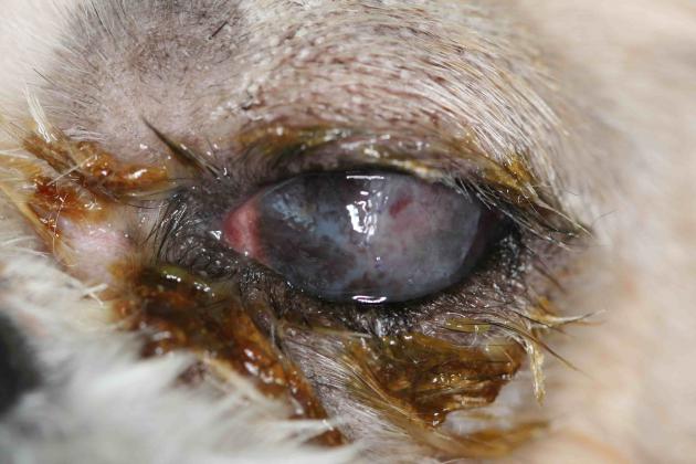 Présence d’une perforation centrale de la cornée avec staphylome, le tout étant couvert d’un bouchon de fibrine. Du pus coule d’une plaie au niveau de la conjonctive palpébrale supérieure.