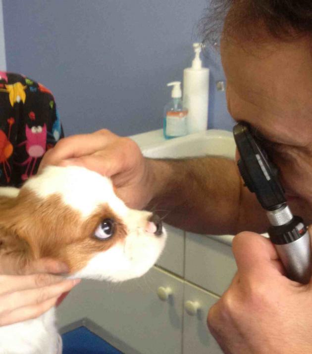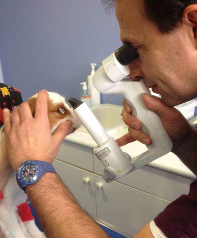 L’examen ophtalmologique comprend une exploration de la vision de l’animal ainsi qu’un examen des différentes structures de l’œil: paupières, conjonctive, cornée, iris, cristallin, rétine.