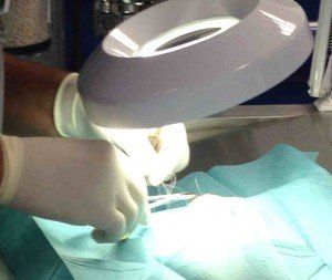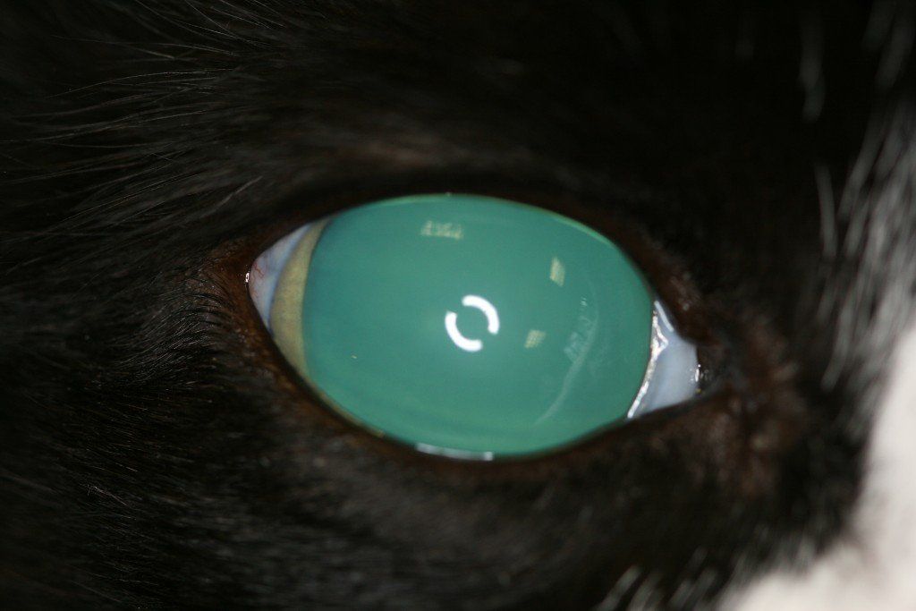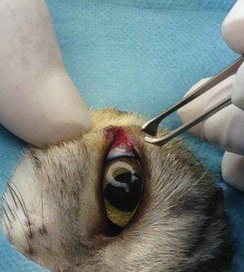 Une intervention est réalisée sous microscope opératoire. La zone est nettoyée et désinfectée. Le bouchon de fibrine est enlevé et révèle un staphylome ( passage d’une partie de l’iris dans la brêche cornéenne). Devant l’ancienneté du staphylope, une section de la partie herniée de l’iris est réalisée. Une rinçage de la chambre antérieure est effectué. Une substance viscoélastique Acrivet Biovisc® 1,2% est injectée pour rétablir le volume oculaire.