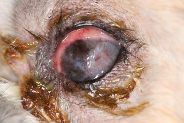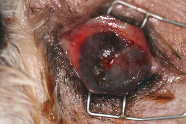 Présence d’une perforation centrale de la cornée avec staphylome, le tout étant couvert d’un bouchon de fibrine. Du pus coule d’une plaie au niveau de la conjonctive palpébrale supérieure.